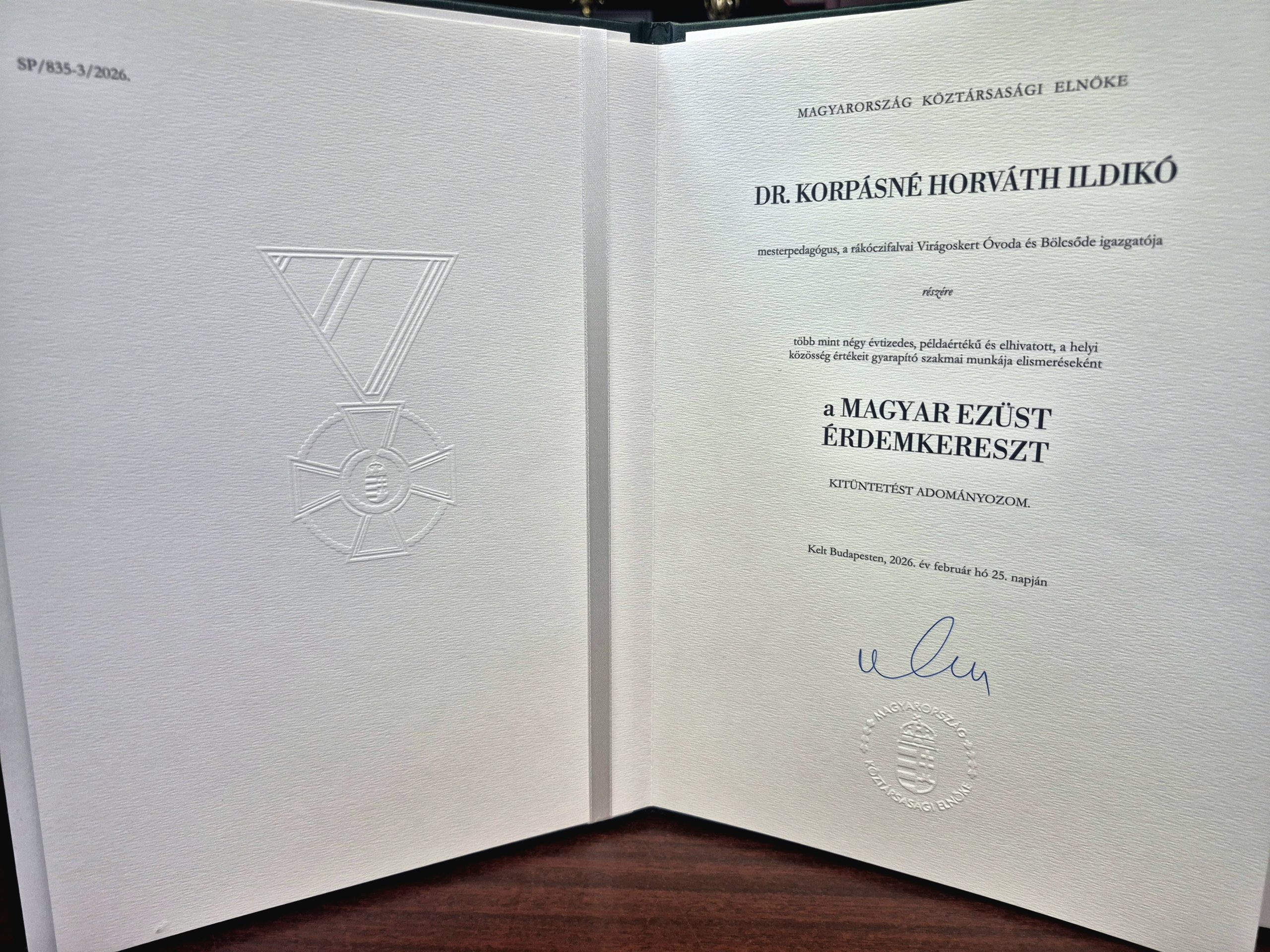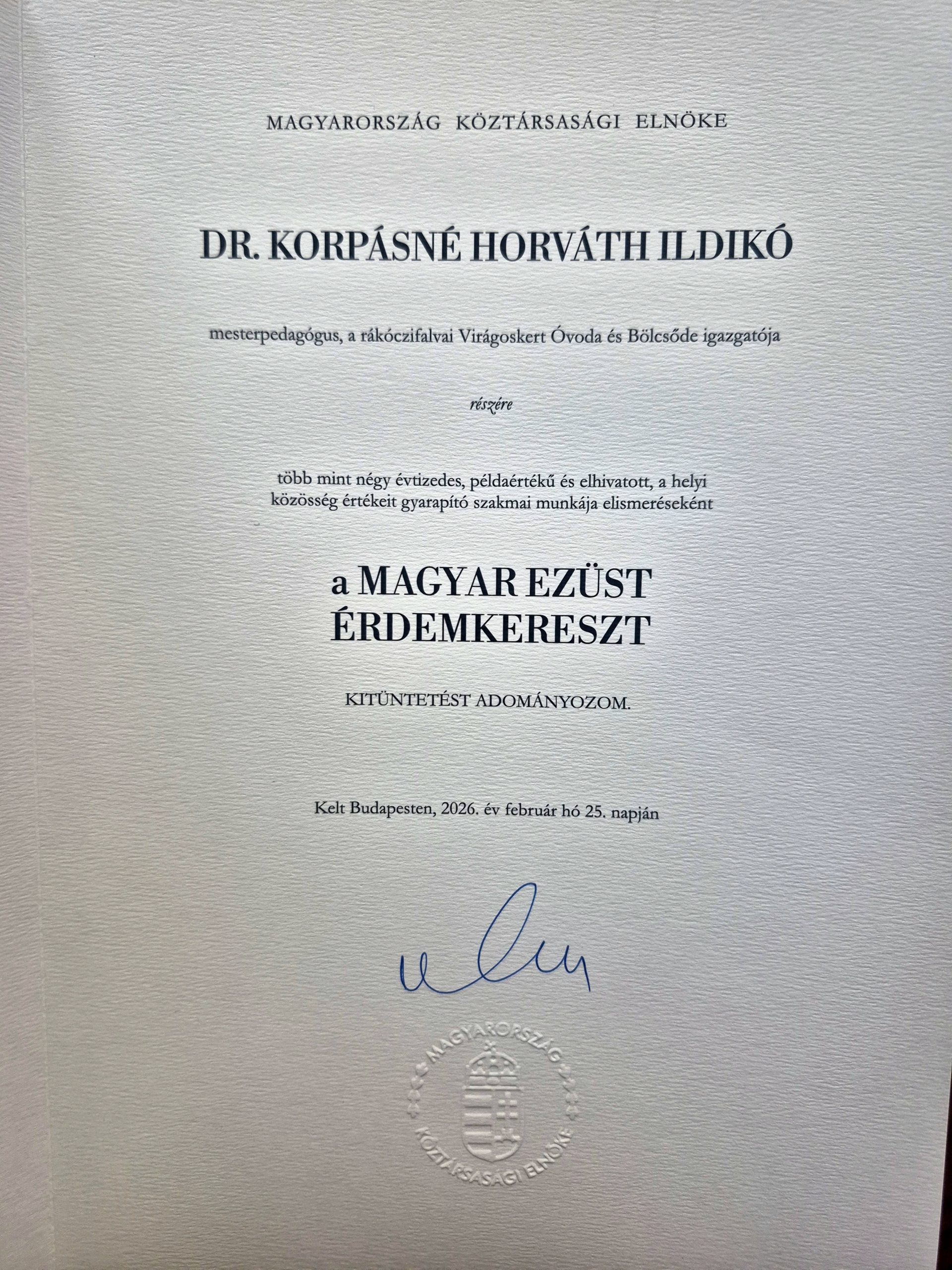 Március 15-ei nemzeti ünnepünk alkalmából Dr. Sulyok Tamás, Magyarország Köztársasági Elnöke Magyar Ezüst Érdemkereszt állami kitüntetést adományozott a több mint négy évtizedes példaértékű és elhivatott, a helyi közösség értékeit gyarapító szakmai munkája elismeréseként Dr. Korpásné Horváth Ildikó, mesterpedagógus, a rákóczifalvai Virágoskert Óvoda és Bölcsőde főigazgatója részére.
